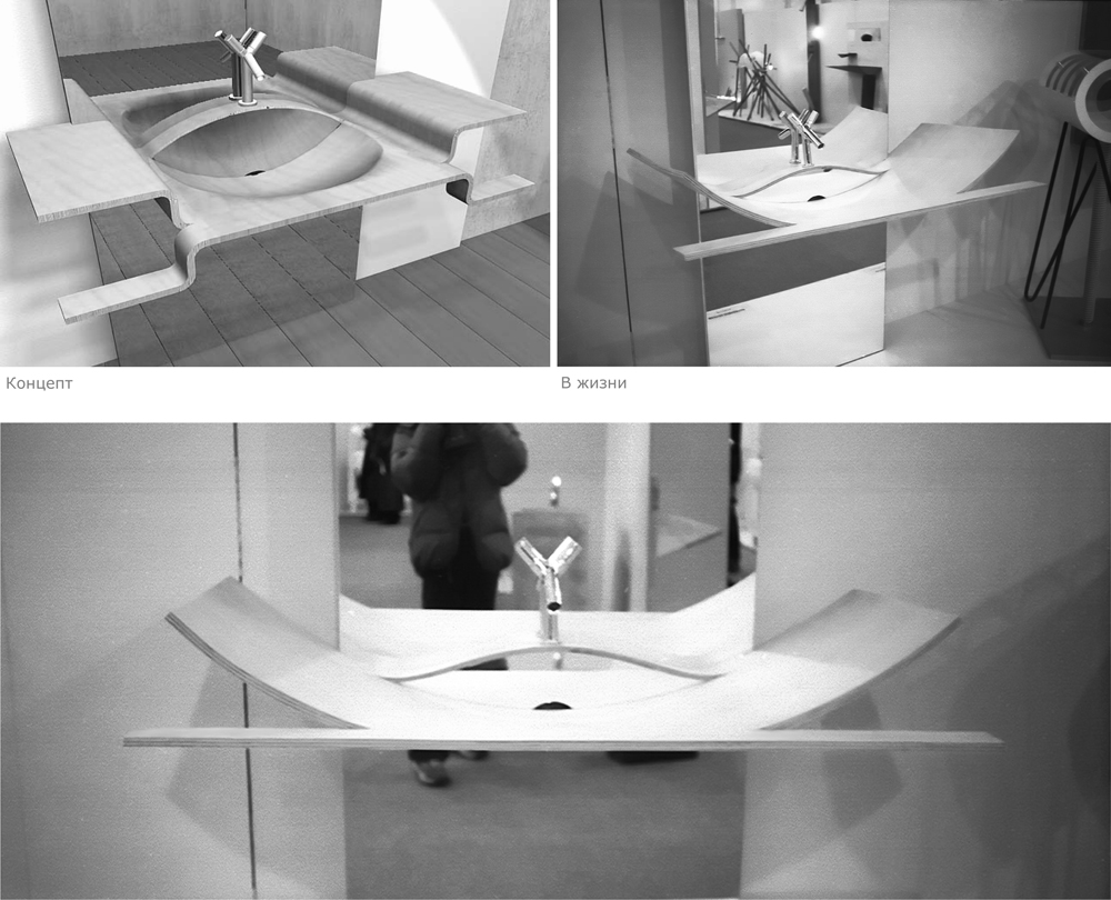 Умывальник, изготовленный из фанеры. Выбор не совсем привычного для ванной комнаты, “теплого” материала привел к созданию выразительной пластики и свежего образа, при этом, ничуть не в ущерб функциональным качествам столь обыденного предмета. Объект выполнен специально для выставки "Водопарад” г. Харьков 2003 г.